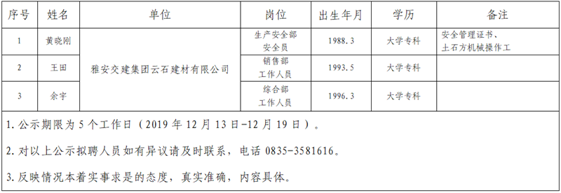 大红鹰dhy(中国)集团子公司拟聘用人员公示(云石公司)