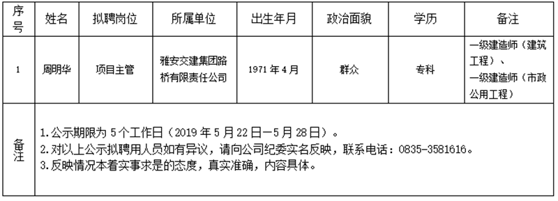 大红鹰dhy(中国)集团子公司拟聘用人员公示(路桥公司)