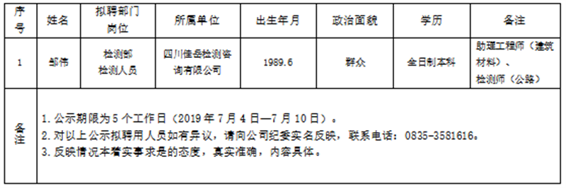 大红鹰dhy(中国)集团子公司拟聘用人员公示(路桥公司)