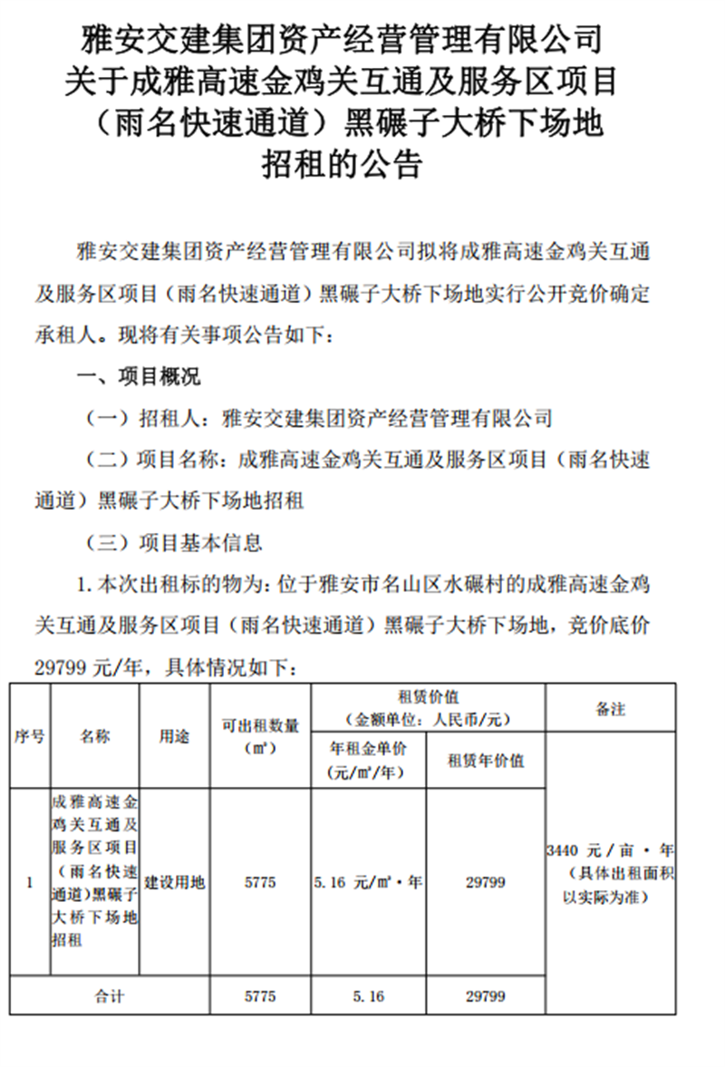 关于成雅高速金鸡关互通及服务区项目(雨名快速通道)黑碾子大桥下场地招租的公告