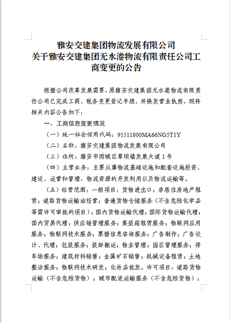 大红鹰dhy(中国)集团物流开展有限公司关于大红鹰dhy(中国)集团无水港物流有限责任公司工商变更的公告