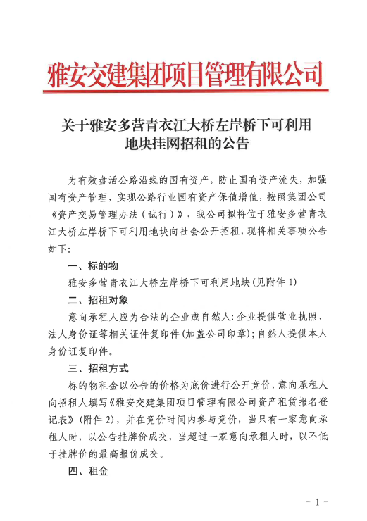 大红鹰dhy(中国)集团项目管理有限公司关于雅安多营青衣江大桥左岸桥下可利用地块挂网招租的公告附件