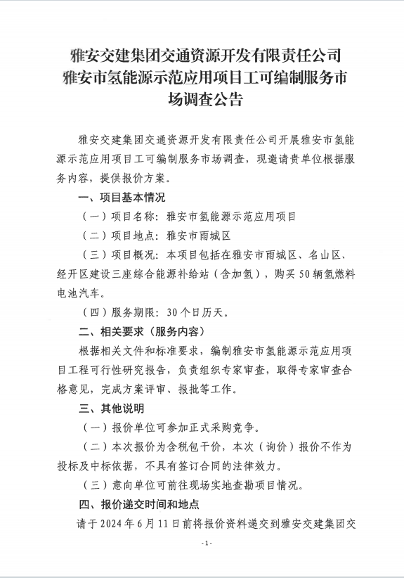 大红鹰dhy(中国)集团交通资源开发有限责任公司雅安市氢能源示范应用项目工可编制服务市场调查公告