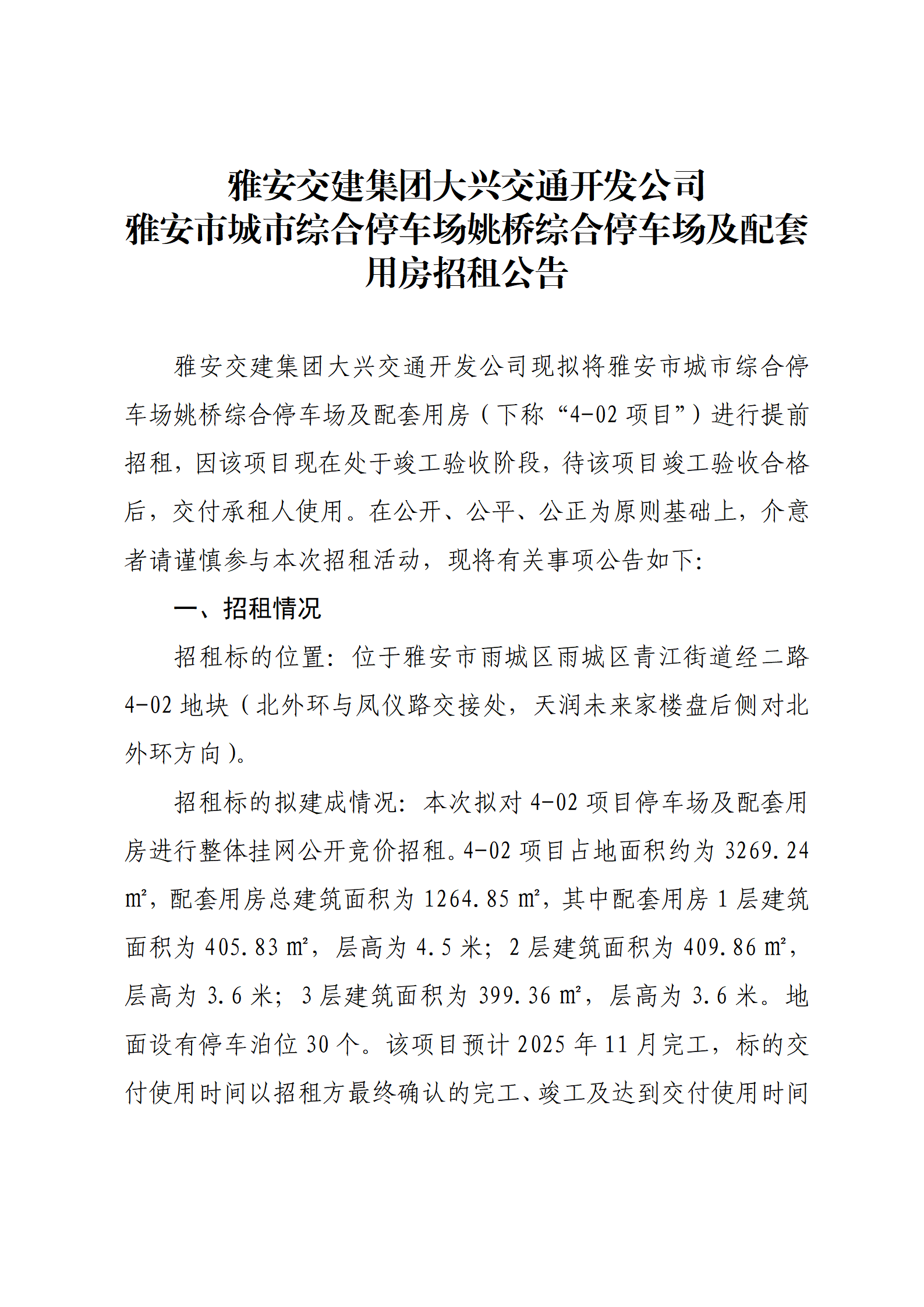 大红鹰dhy(中国)集团大兴交通开发公司 雅安市城市综合停车场姚桥综合停车场及配套用房招租公告