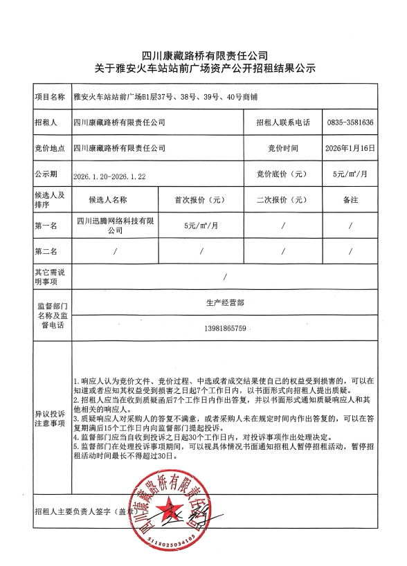 四川康藏路桥有限责任公司关于雅安火车站站前广场资产公开招租结果公示