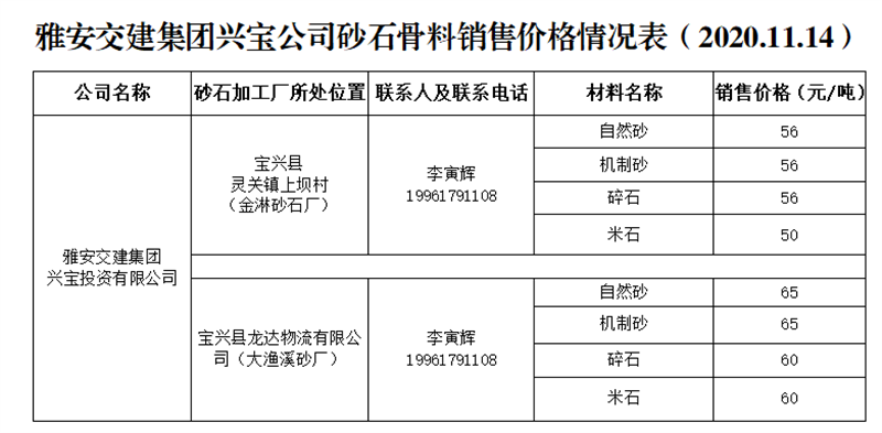 大红鹰dhy(中国)集团兴宝公司砂石骨料销售价格情况表(2020.11.14)