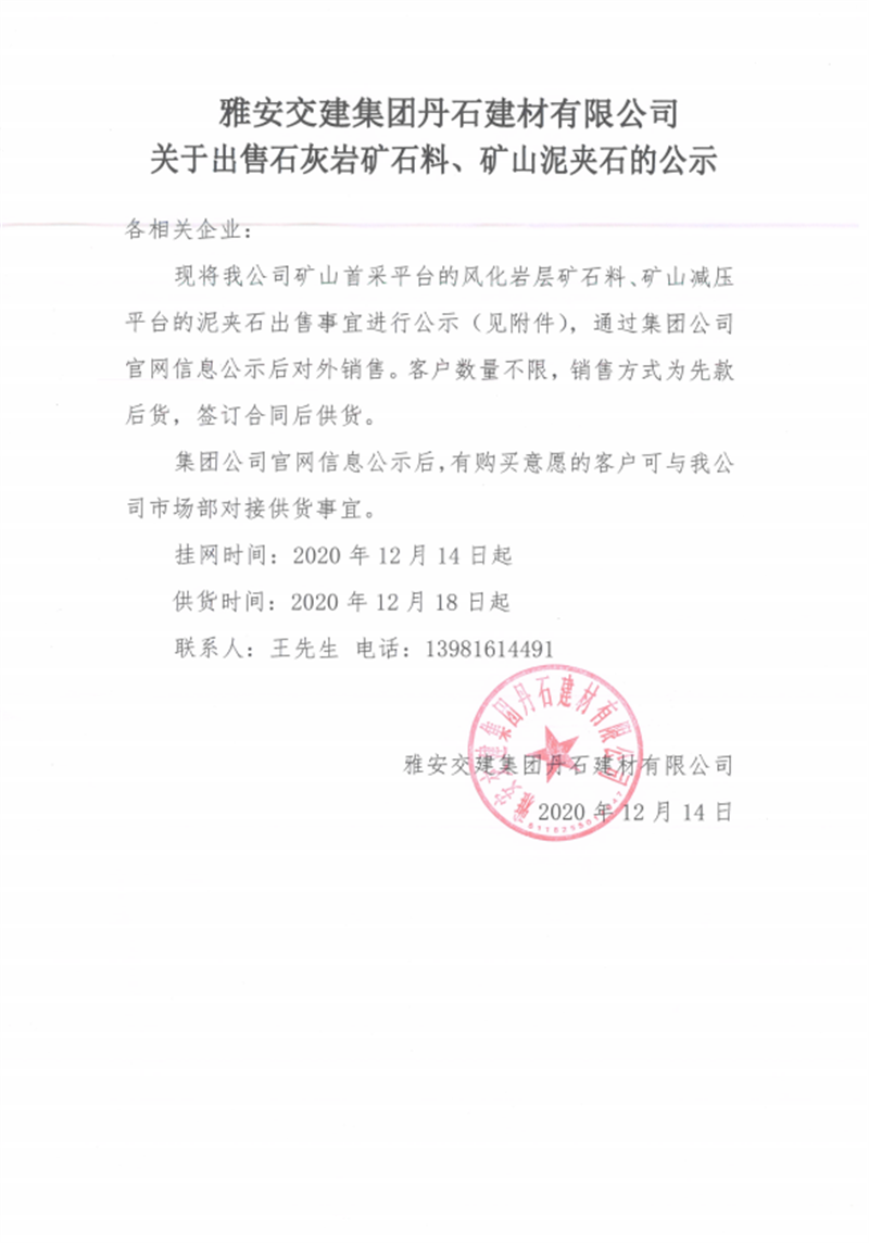 大红鹰dhy(中国)集团丹石建材有限公司关于出售石灰岩矿山料、矿山泥夹石的公示