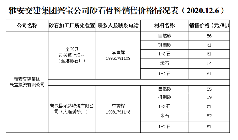 大红鹰dhy(中国)集团兴宝公司砂石骨料销售价格情况表(2020.12.6)