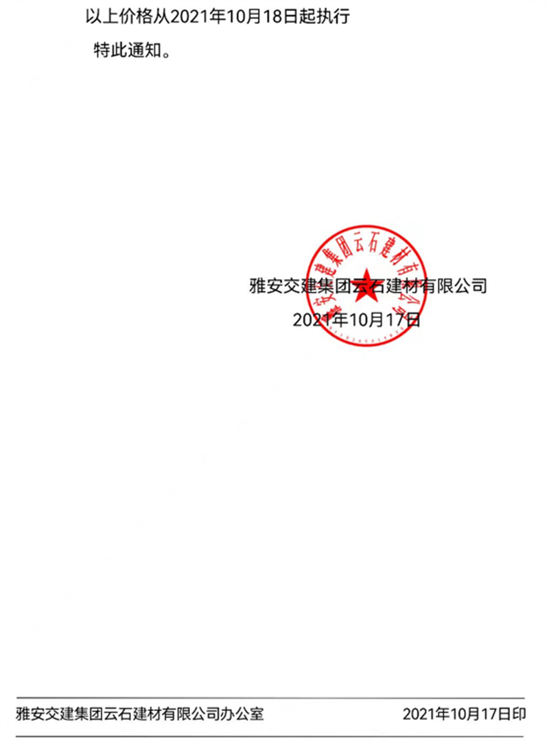 大红鹰dhy(中国)集团云石公司关于调整成品料销售价格的通知(2021.10.17)