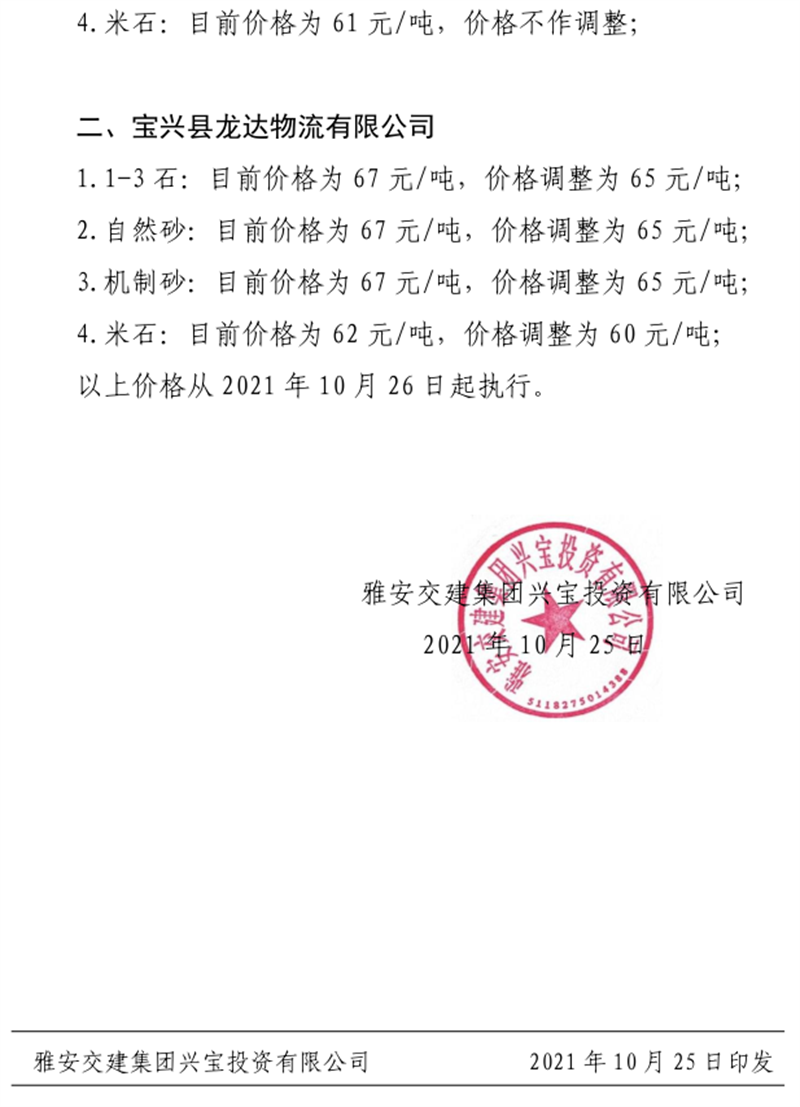 大红鹰dhy(中国)集团丹石公司关于调整成品骨料及风化矿石料销售价格的通知(2021.10.26)