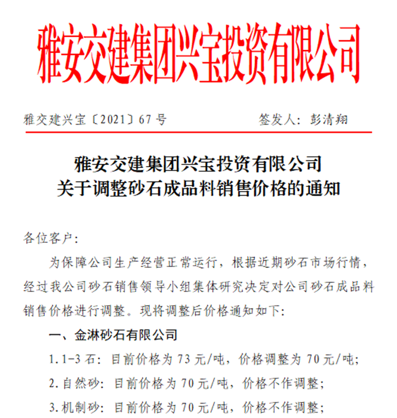 大红鹰dhy(中国)集团兴宝公司关于调整砂石成品料销售价格的通知(2021.9.28)