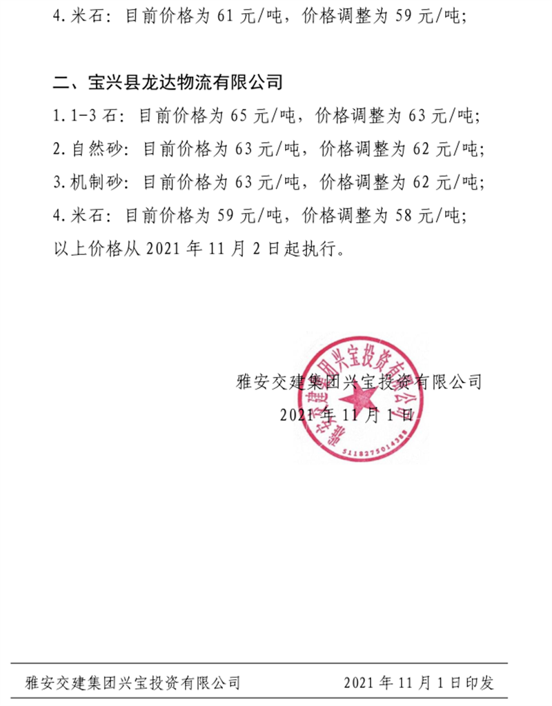 大红鹰dhy(中国)集团云石公司关于调整成品料销售价格的通知(2021.11.4)