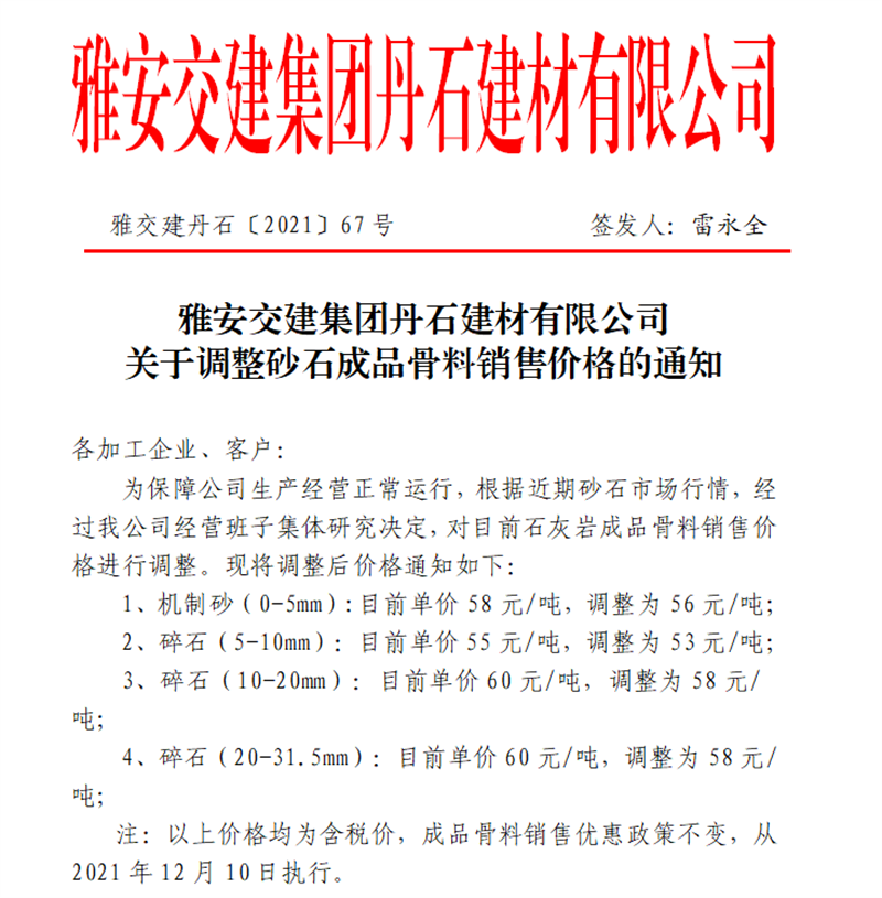 大红鹰dhy(中国)集团丹石公司关于调整砂石成品骨料销售价格的通知(2021.12.9)