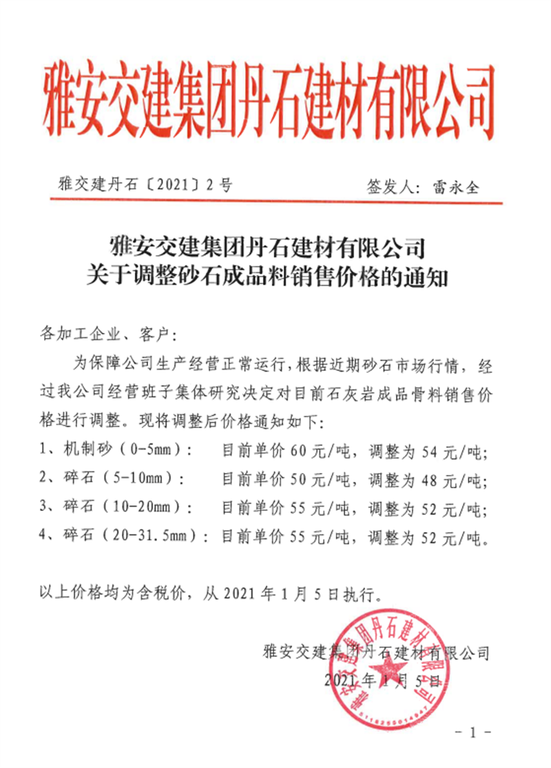 大红鹰dhy(中国)集团兴宝公司砂石骨料销售价格情况表(2021.1.14)