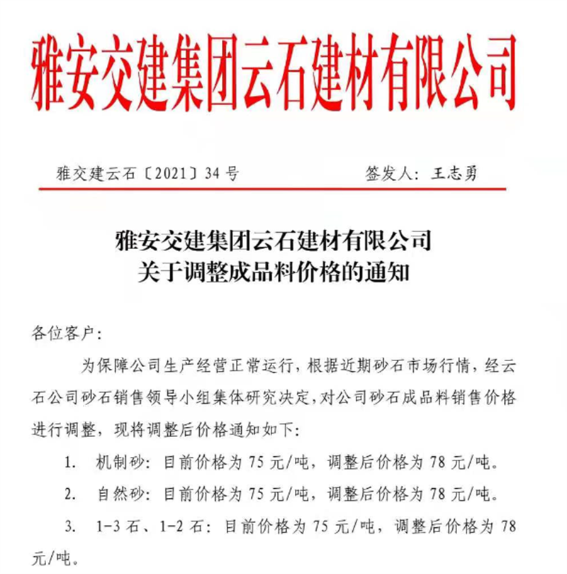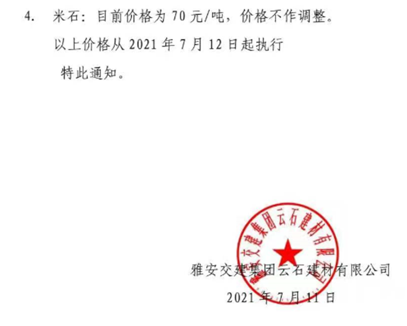 大红鹰dhy(中国)集团云石公司砂石骨料销售价格情况表(2021.7.12)