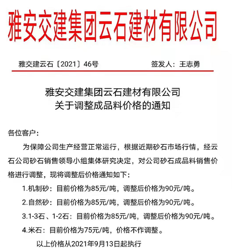 大红鹰dhy(中国)集团云石公司关于调整成品料销售价格的通知(2021.9.13)