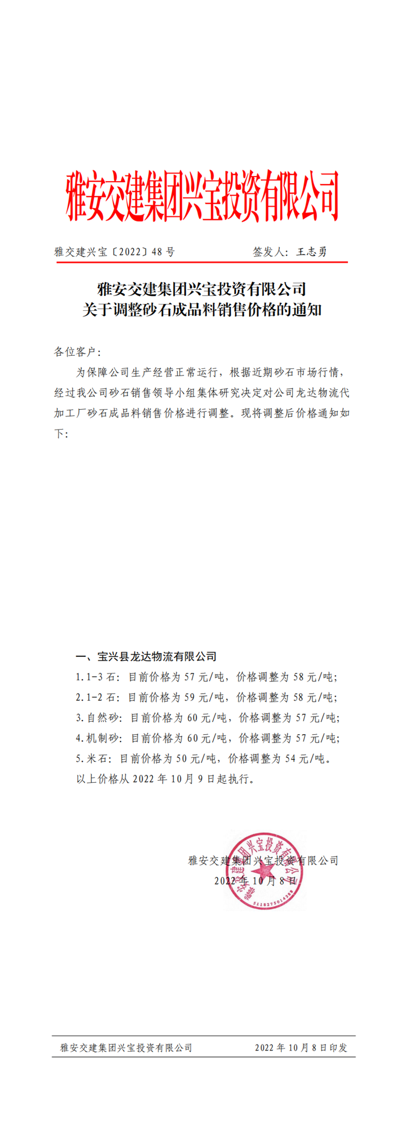 雅交建兴宝〔2022〕48号 关于调整砂石成品料销售价格的通知10.8