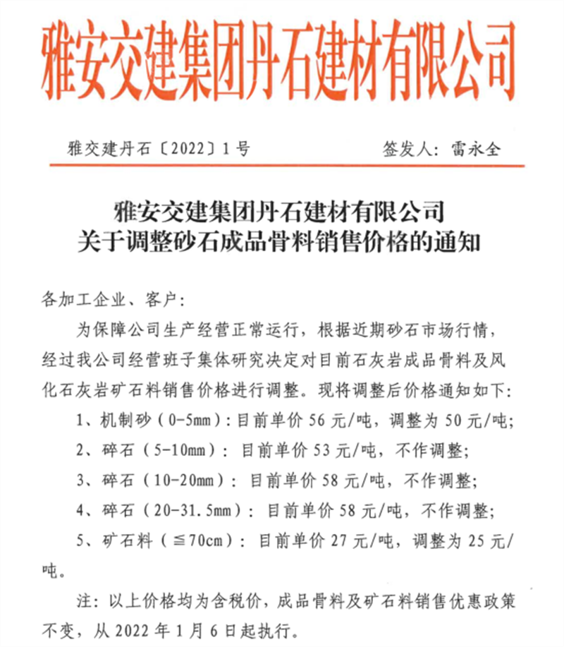 大红鹰dhy(中国)集团丹石公司关于调整砂石成品骨料销售价格的通知(2022.1.5)