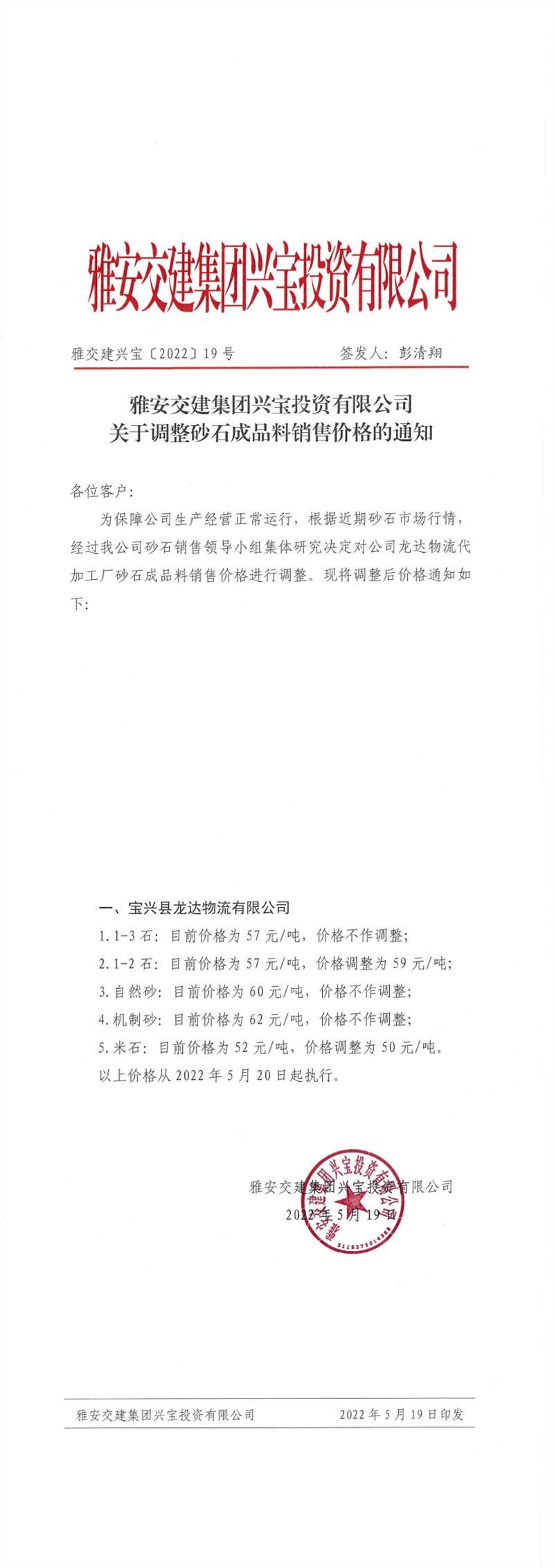 大红鹰dhy(中国)集团兴宝公司关于调整砂石成品料销售价格的通知-2022-5-19