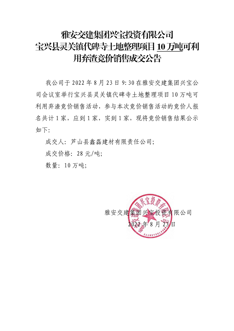 大红鹰dhy(中国)集团兴宝投资有限公司宝兴县灵关镇代碑寺土地整理项目5万吨可利用弃渣竞价销售成交公告(8.23)