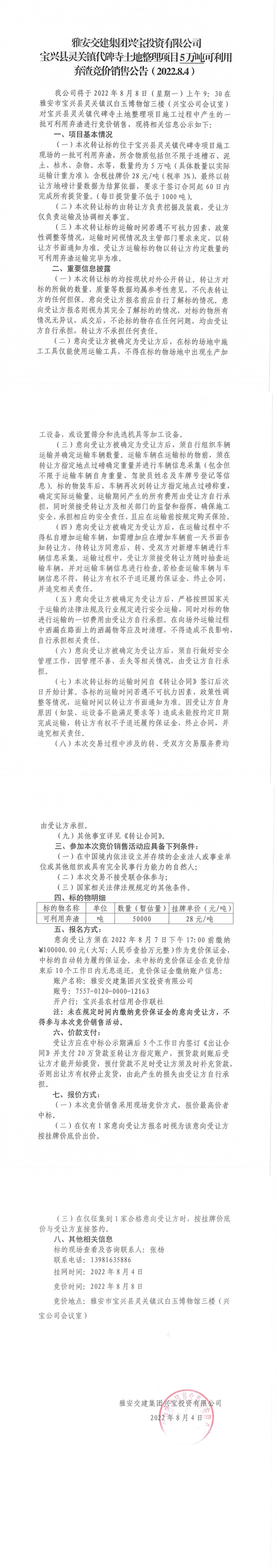 大红鹰dhy(中国)集团兴宝投资有限公司灵关镇代碑寺土地整理项目5万吨可利用弃渣竞价销售公告(2022.8.4)