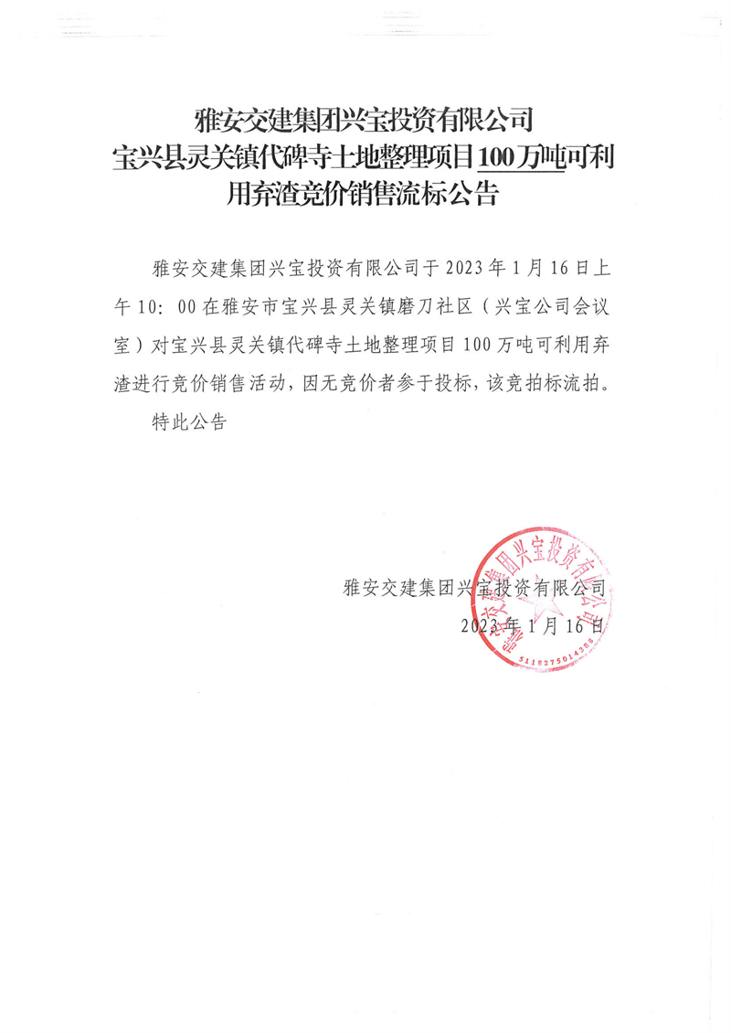 大红鹰dhy(中国)集团兴宝投资有限公司100万吨可利用弃渣竞价销售流标公告(2023.1.16)