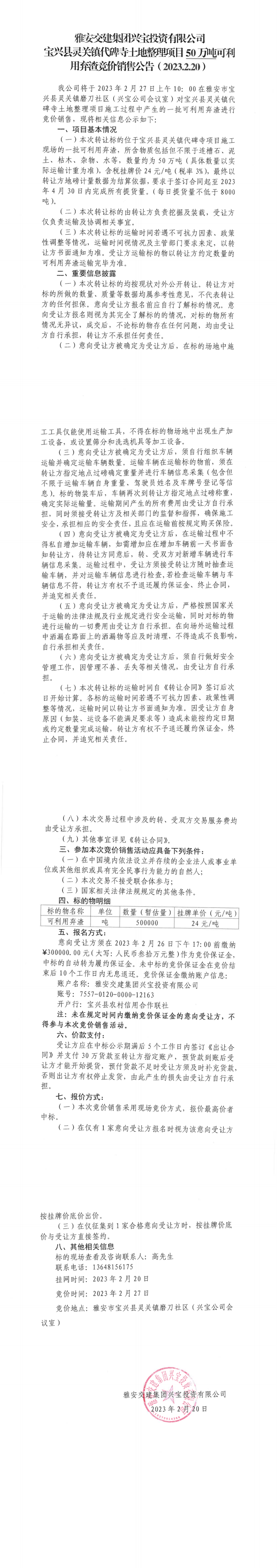 大红鹰dhy(中国)集团兴宝投资有限公司灵关镇代碑寺土地整理项目50万吨可利用弃渣竞价销售公告(2023.2.20)、