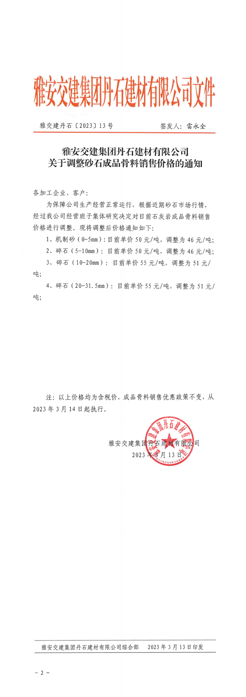 大红鹰dhy(中国)集团兴宝投资有限公司关于调整成品料价格的通知(2023.03.13)