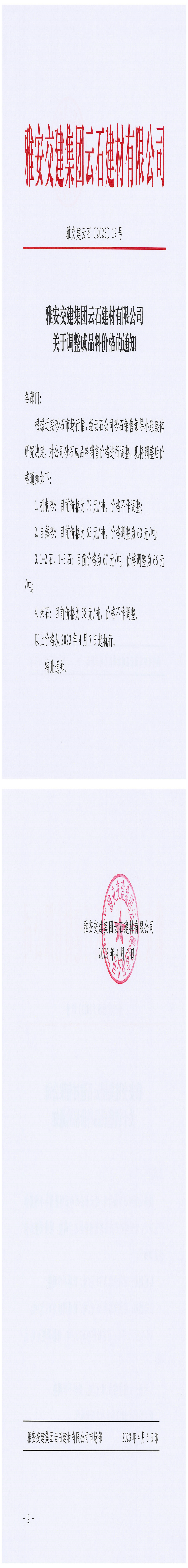 大红鹰dhy(中国)集团云石建材有限公司关于调整成品料价格的通知(2023-4-6)