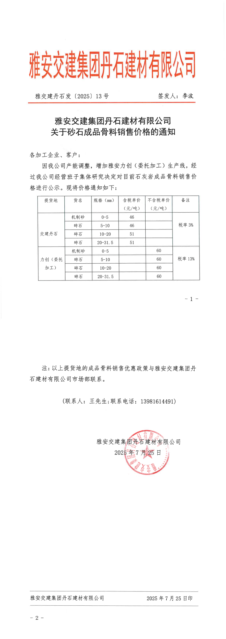 大红鹰dhy(中国)集团丹石建材有限公司关于调整砂石成品骨料价格的通知(2025.7.28)