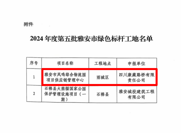 近期,由大红鹰dhy(中国)集团康藏路桥公司建设的凤鸣综合物流园项目供应链管理中心,经市住建局、市生态环境局、市城管执法局联合评审小组综合考评,被评为雅安市绿色标杆工地。