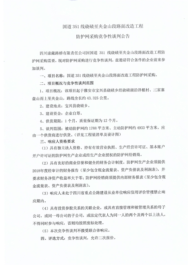 四川康藏路桥有限责任公司国道351线硗碛至夹金山段路面改造工程防护网采购竞争性谈判公告
