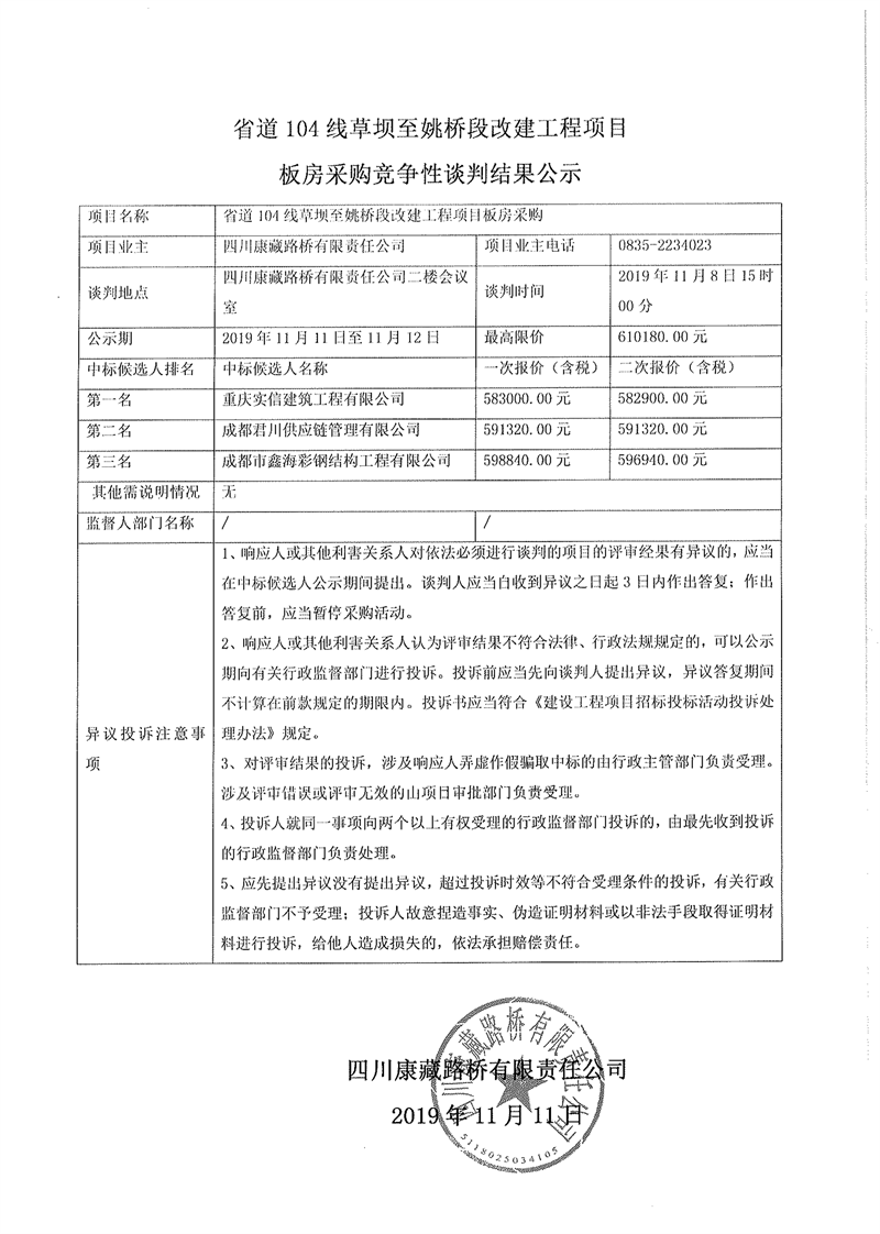四川康藏路桥有限责任公司省道104线草坝至姚桥段改建工程项目板房采购竞争性谈判结果公示
