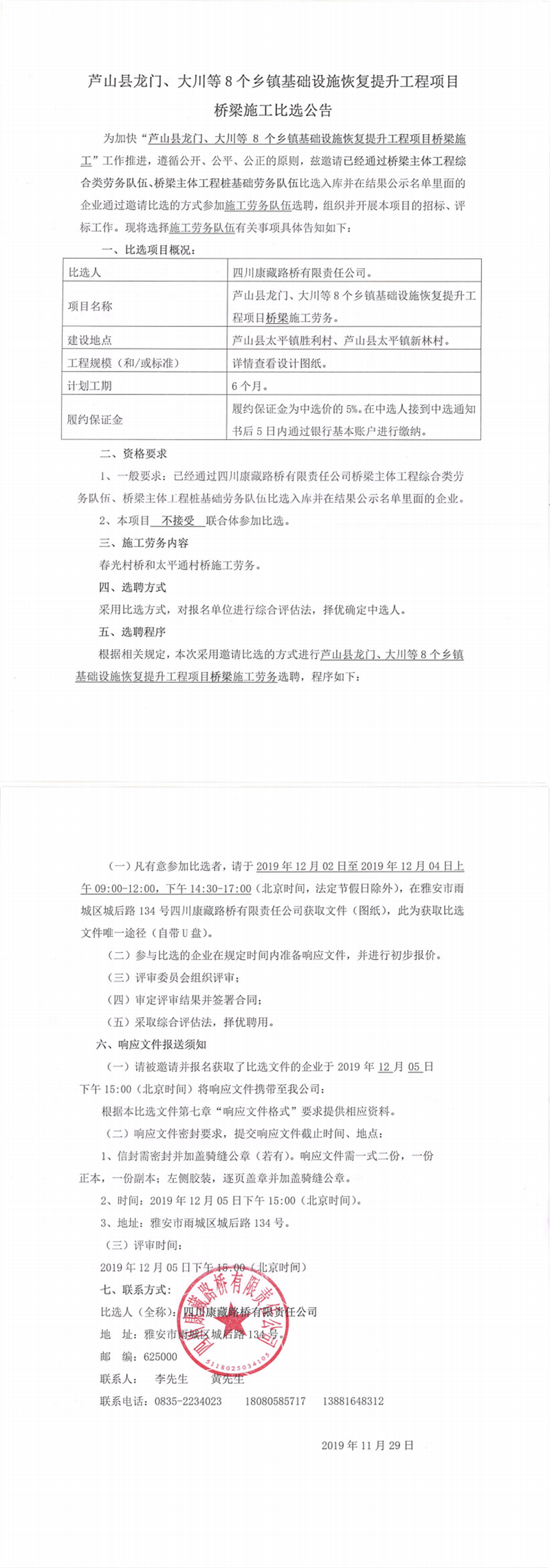 四川康藏路桥有限责任公司芦山县龙门、大川等8个乡镇基础设施恢复提升工程项目施工劳务竞价结果公示