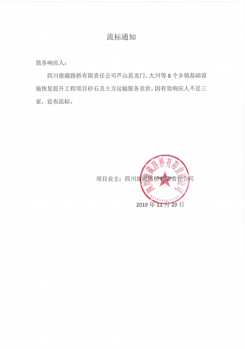 四川康藏路桥有限责任公司芦山县龙门、大川等8个乡镇基础设施恢复提升工程项目砂石及土方运输服务竞价流标通知