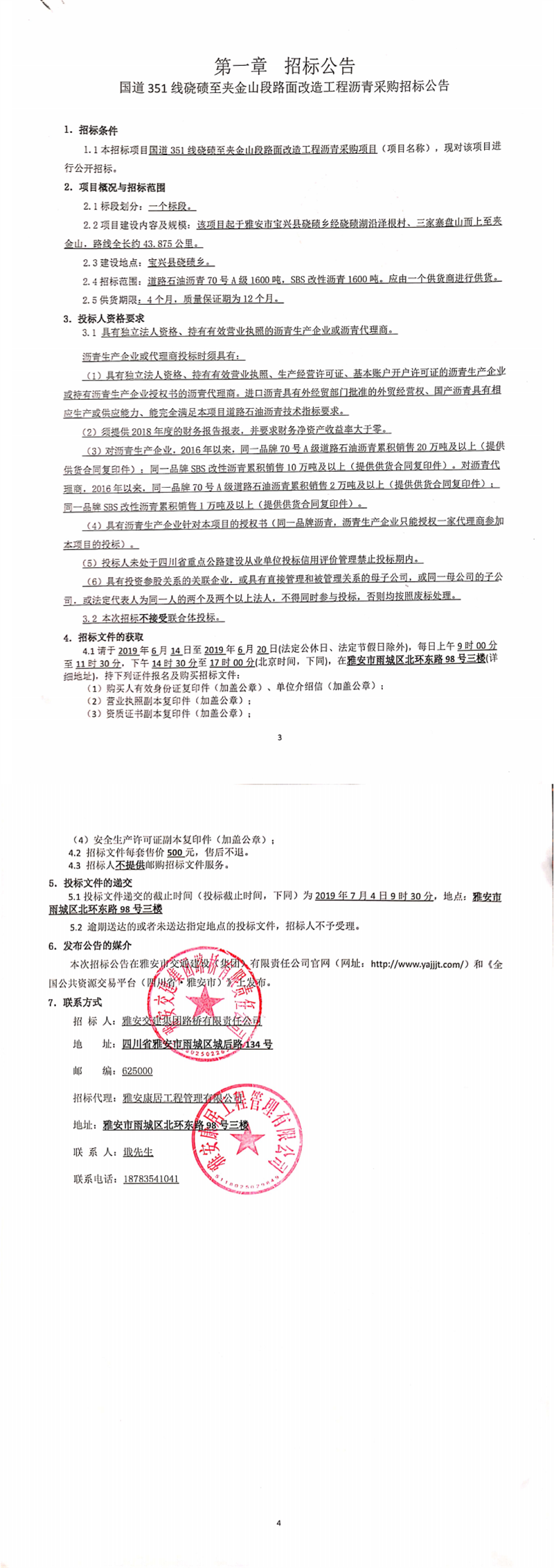大红鹰dhy(中国)集团路桥有限责任公司国道351线硗碛至夹金山段路面改造工程沥青采购招标公告