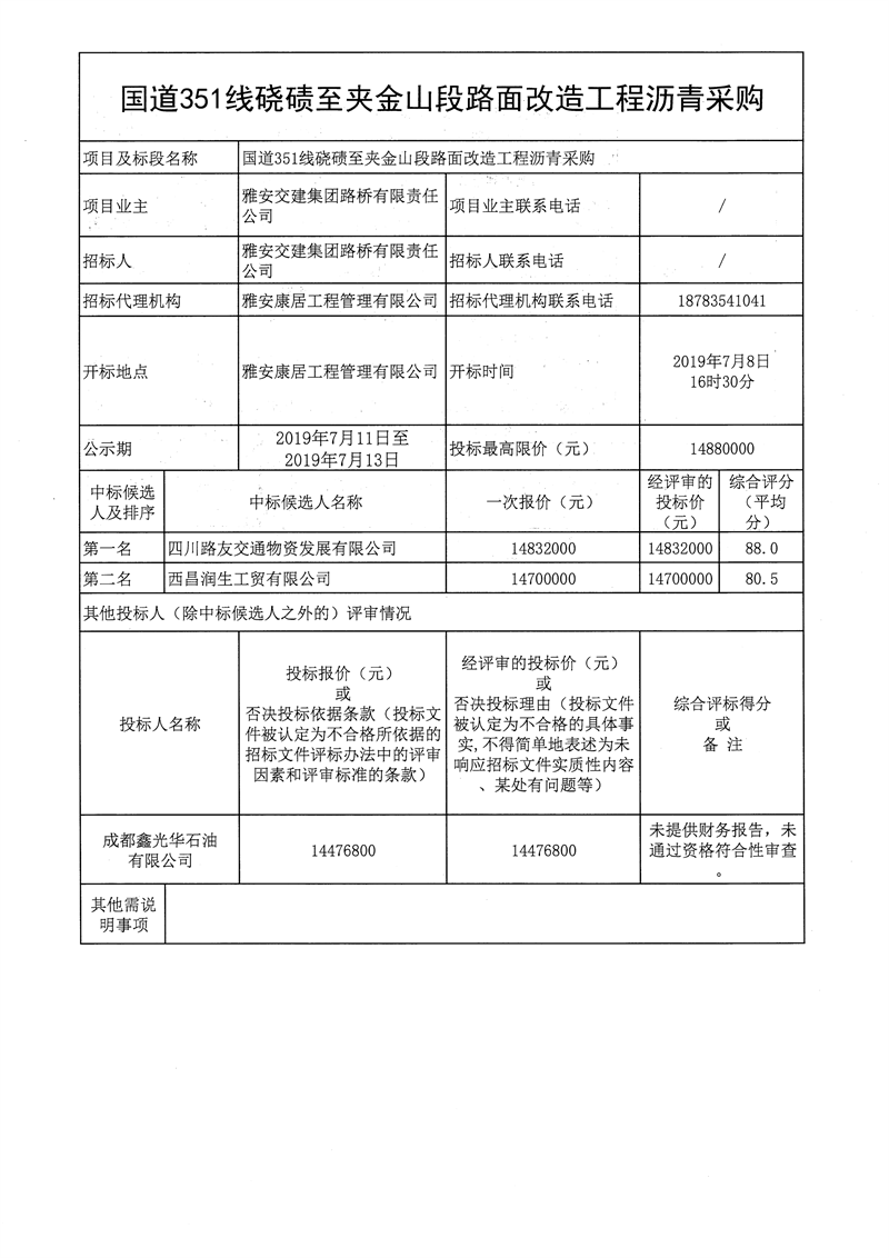 大红鹰dhy(中国)集团路桥有限责任公司国道351线硗碛至夹金山段路面改造工程沥青采购公开招标结果公示