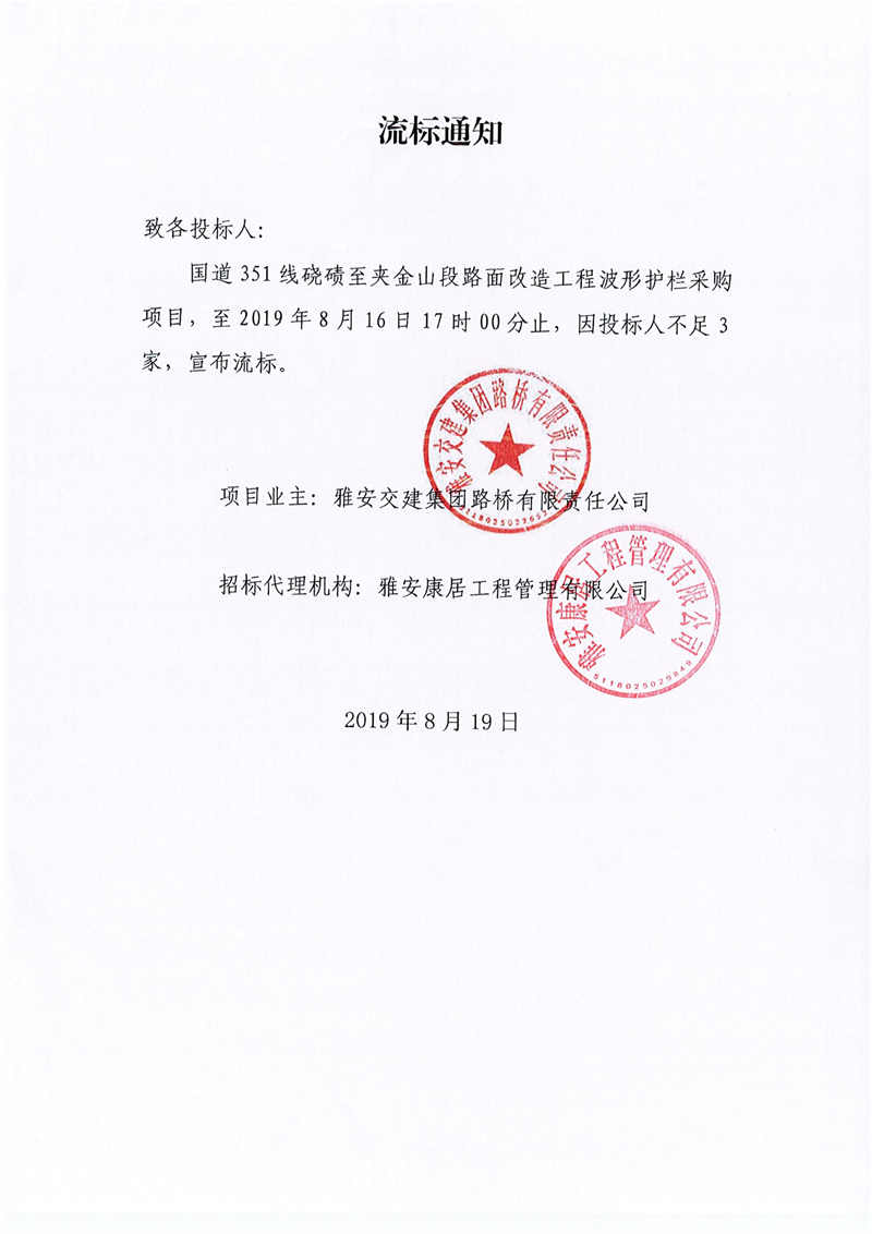 大红鹰dhy(中国)集团路桥有限责任公司国道351线硗碛至夹金山段路面改造工程波形护栏采购项目流标通知