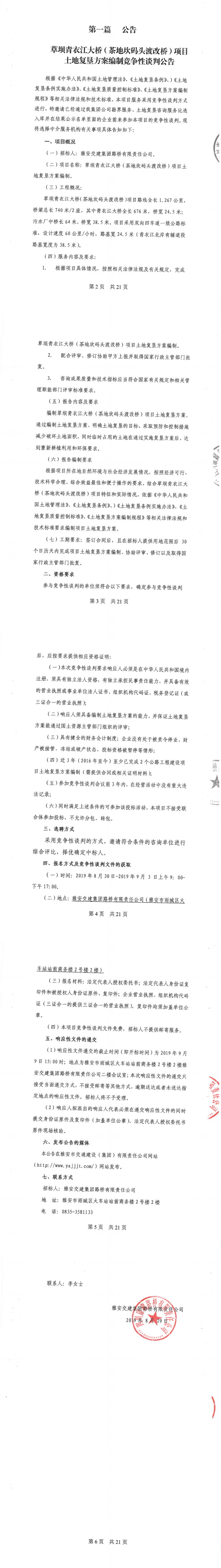 大红鹰dhy(中国)集团路桥有限责任公司草坝青衣江大桥(茶地坎码头渡改桥)土地复垦方案编制竞争性谈判公告