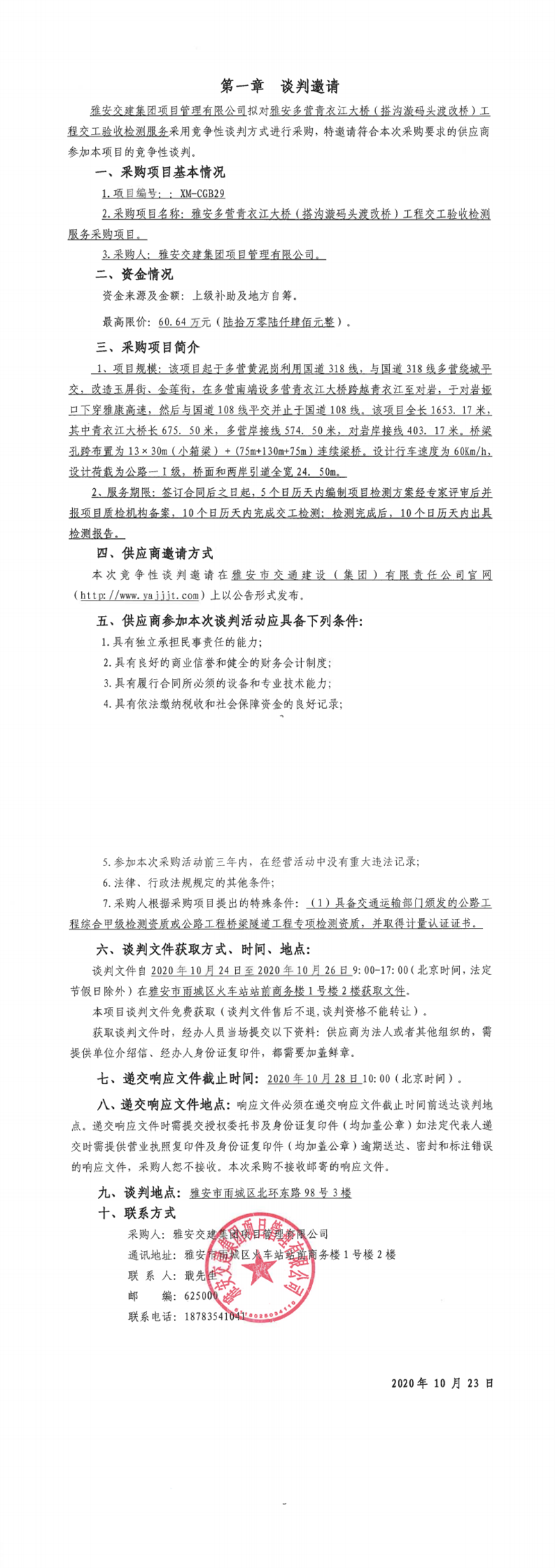 大红鹰dhy(中国)集团项目管理有限公司雅安多营青衣江大桥(搭沟漩码头渡改桥)工程交工验收检测服务采购项目竞争性谈判公告