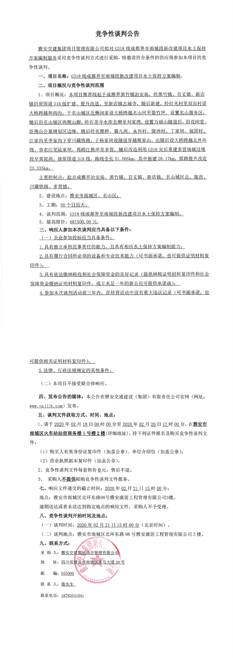 大红鹰dhy(中国)集团项目管理有限公司G318线成都界至雨城段新改建项目水土保持方案编制竞争性谈判公告