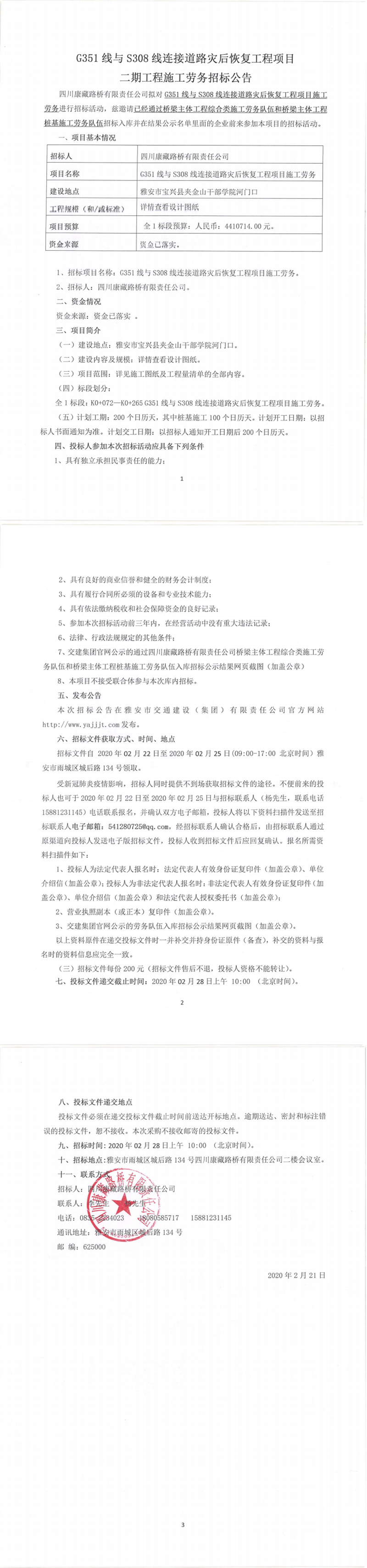 四川康藏路桥有限责任公司G351线与S308线连接道路灾后恢复工程项目二期工程施工劳务招标公告