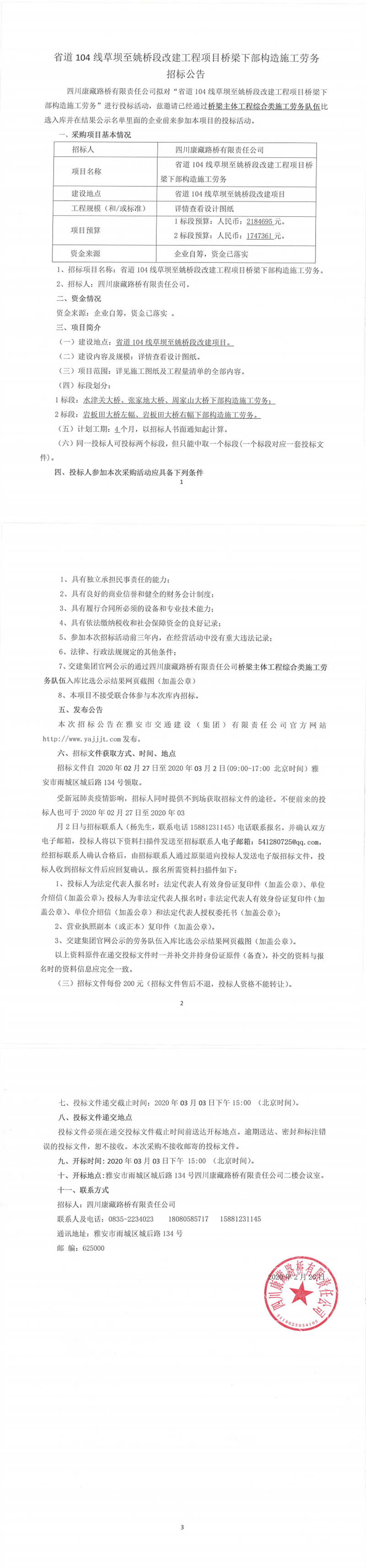 四川康藏路桥有限责任公司省道104线草坝至姚桥段改建工程项目桥梁下部构造施工劳务招标公告