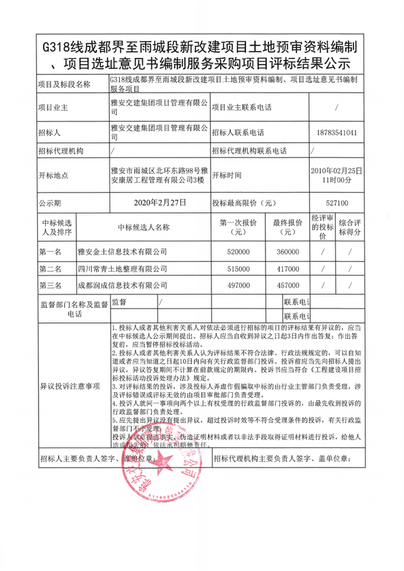 大红鹰dhy(中国)集团项目管理有限公司G318线成都界至雨城段新改建项目土地预审资料编制、项目选址意见书编制服务采购项目评标结果公示