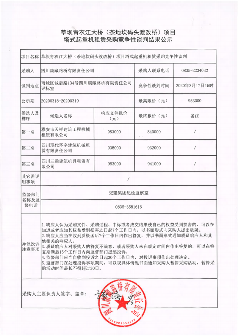四川康藏路桥有限责任公司草坝青衣江大桥(茶地坎渡改桥)项目塔式起重机租赁采购竞争性谈判结果公示