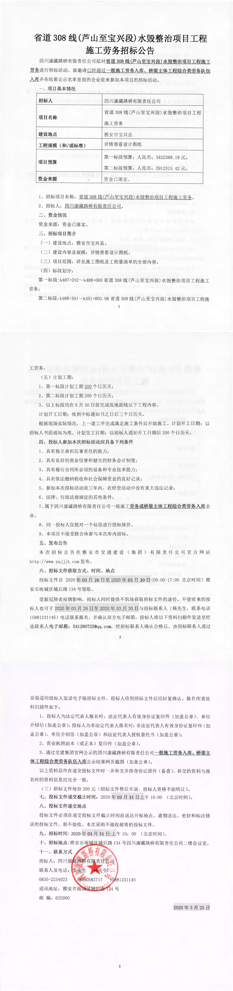 四川康藏路桥有限责任公司省道308线(芦山至宝兴段)水毁整治项目工程施工劳务招标公告