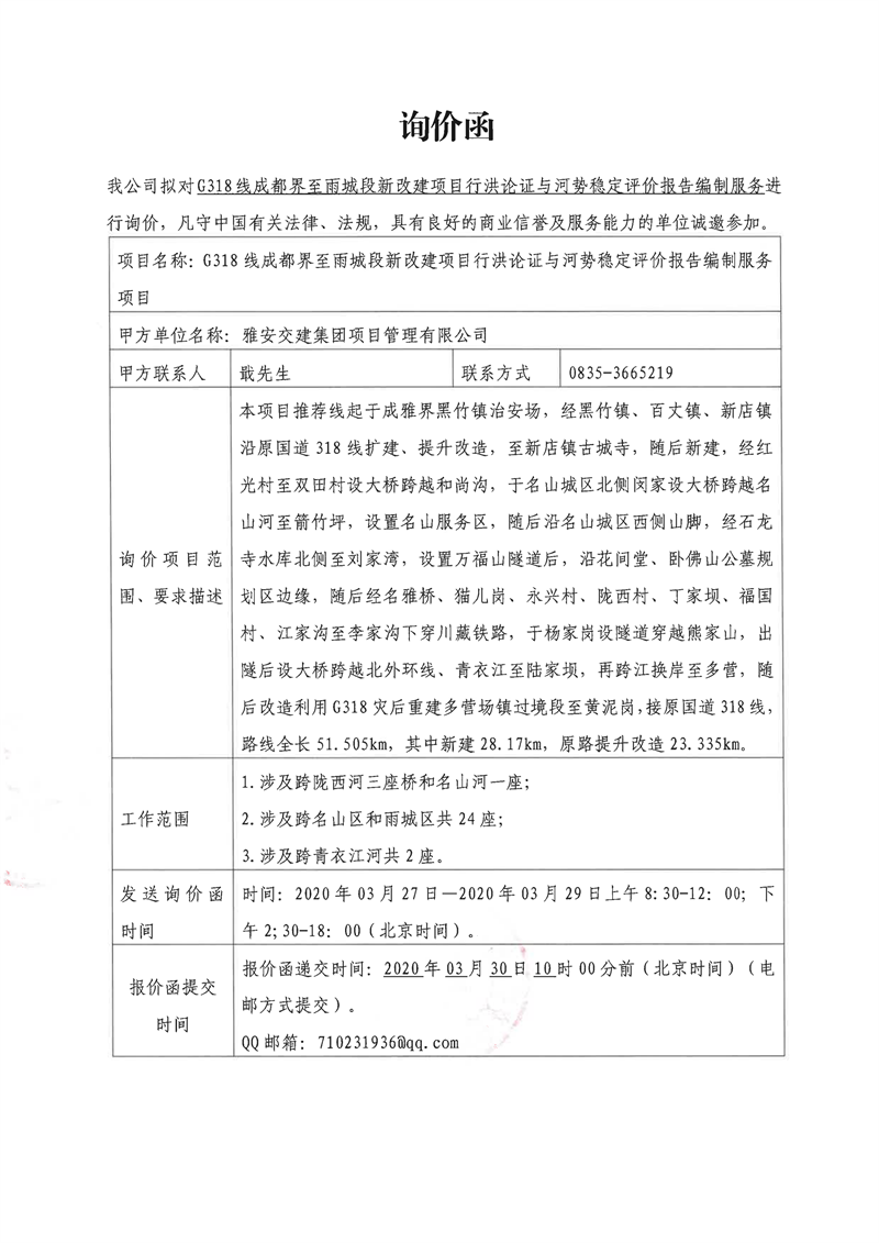 大红鹰dhy(中国)集团项目管理有限公司G318线成都界至雨城段新改建项目行洪论证与河势稳定评价报告编制服务项目询价函