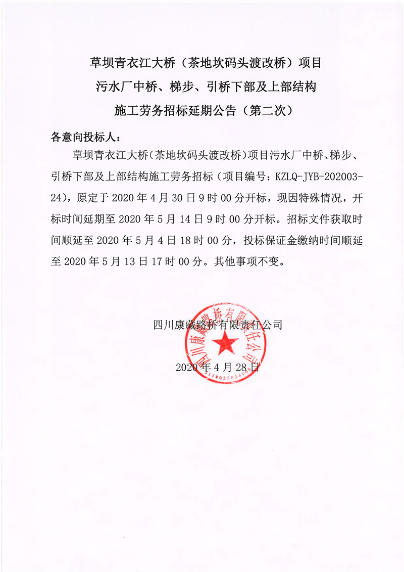 四川康藏路桥有限责任公司草坝青衣江大桥(茶地坎码头渡改桥)项目污水厂中桥、梯步、引桥下部及上部结构施工劳务招标延期公告(第二次)