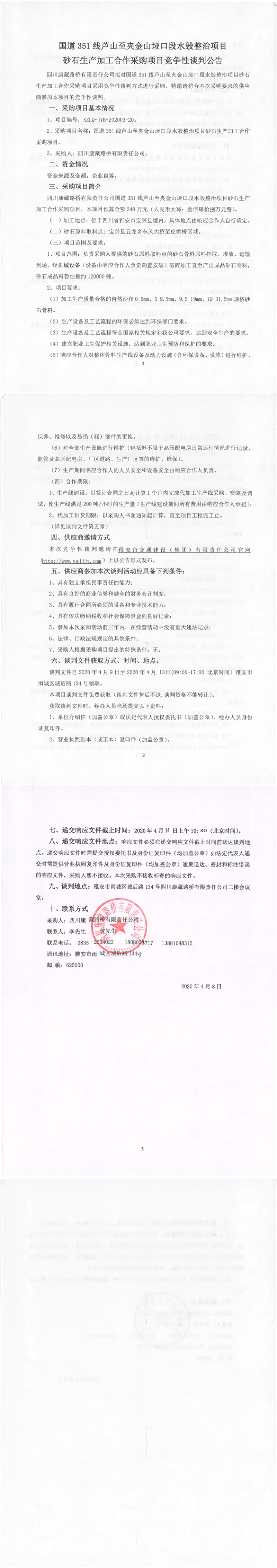 四川康藏路桥有限责任公司国道351线芦山至夹金山垭口段水毁整治项目砂石生产加工合作采购项目竞争性谈判公告