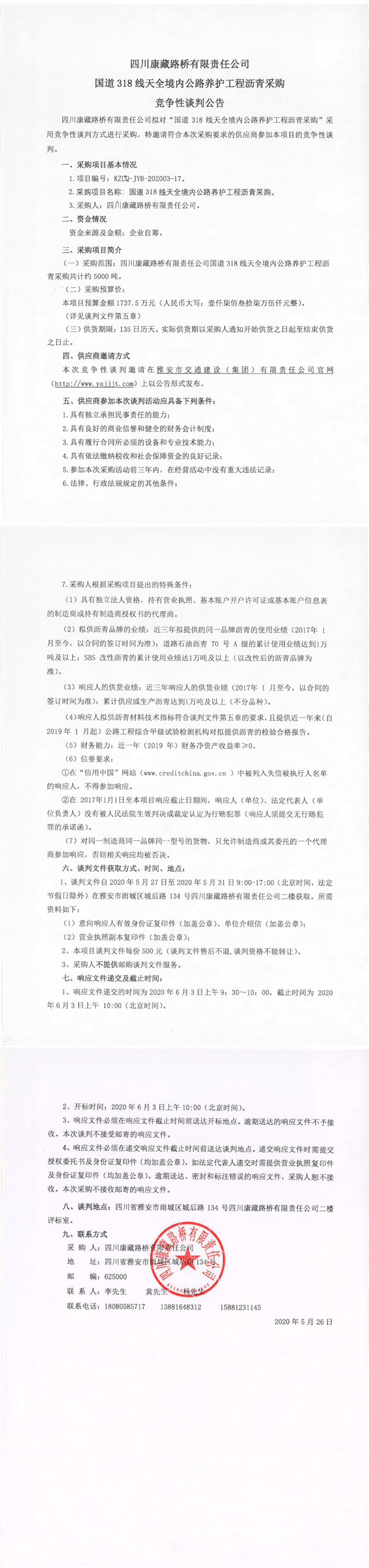 四川康藏路桥有限责任公司国道318线天全境内公路养护工程沥青采购竞争性谈判公告